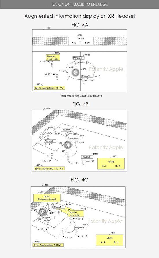 苹果专利图 4A-4C 说明了基于物理环境(包括足球比赛)的 XR 环境,有关球员、分数等的增强数据的一些示例以黄色突出显示。