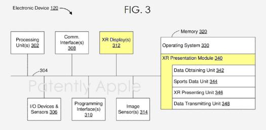 苹果专利图 3 是与苹果 XR 头显(如 Apple Vision Pro)(包括未来的智能眼镜等可能的设备)相关的电子设备 #120 示例的框图。下面标注的 XR 演示模块 #340 被配置成经由一个或多个 XR 显示器 #312 向用户呈现 XR 内容。