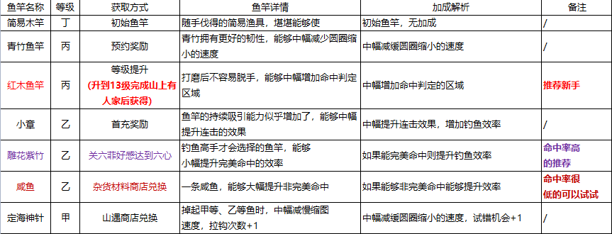 3.1 鱼竿分为甲乙丙丁四种鱼竿,获取方式也不一样,详细内容可以看下图: