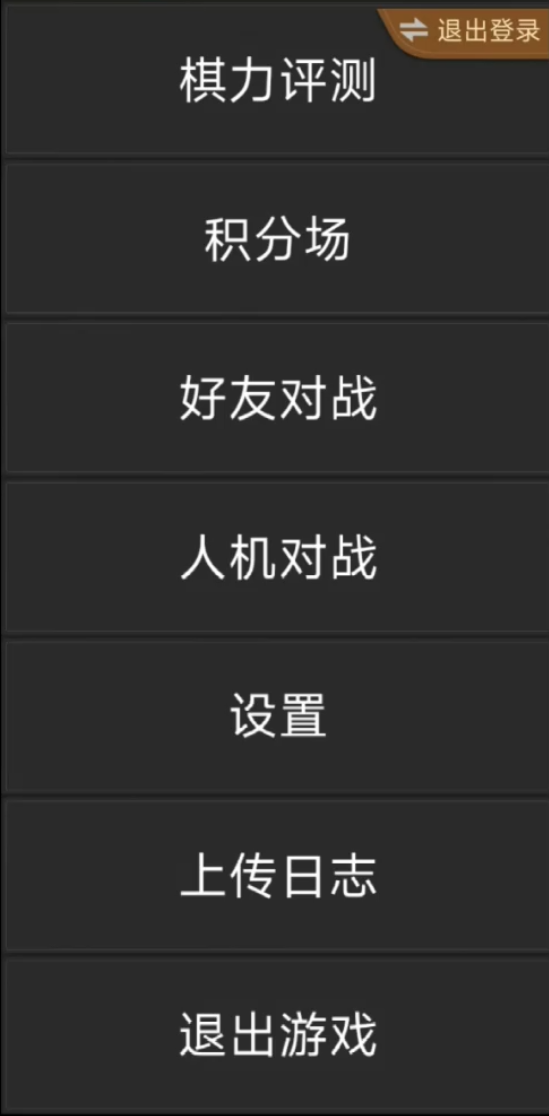 退出登录、棋力评测、积分场、好友对战、人机对战、设置、上传日志、退出游戏。