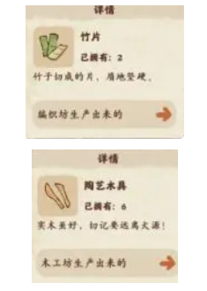 1、1祈愿灯=2木材+3青竹,木材在伐木林获取,青竹在竹林获取,这个玩法会涉及四处地点与建筑的产物,分别是伐木林、木工、竹林、编织,我们需要用1个陶艺木具、1个竹片来制作祈愿灯;